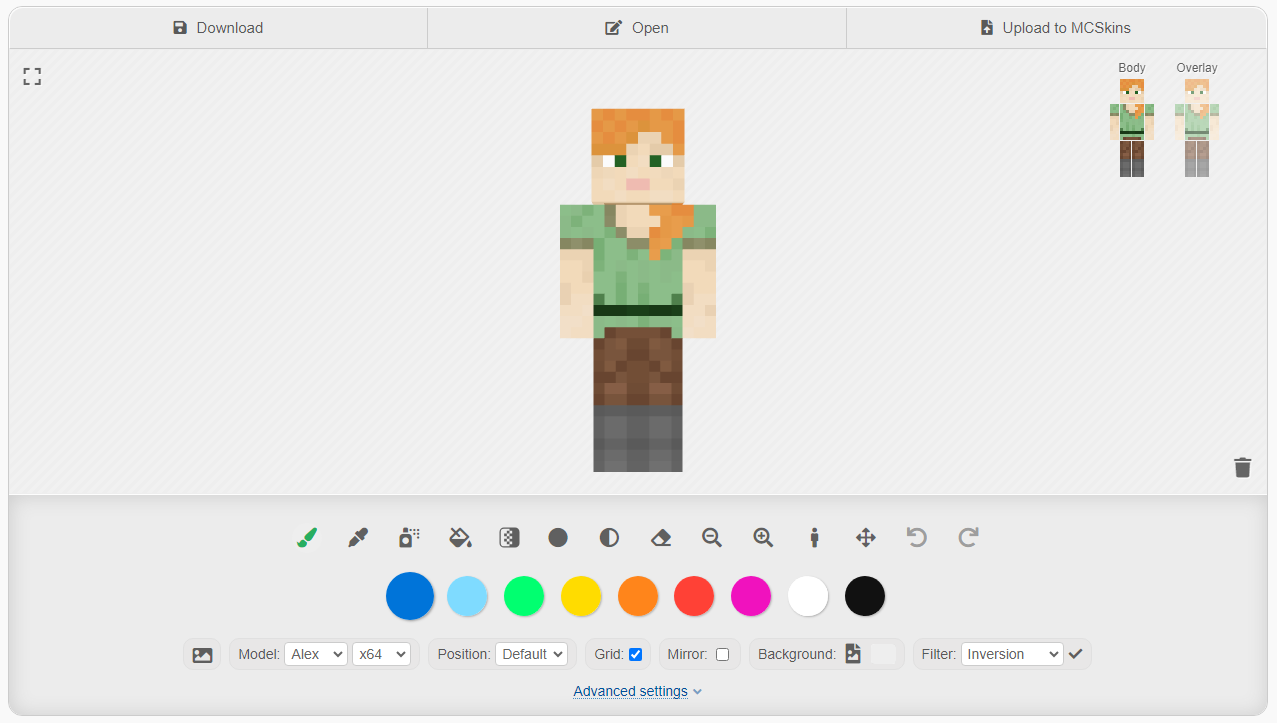 To kickstart the design process, we recommend using the <https://mcskins.top/editor> editor. Simply follow the provided link, select the "Alex" model type, and you're ready to dive into the creative journey.